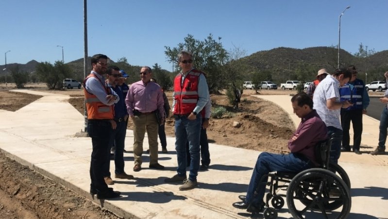 En el recorrido, se revisó el avance de la obra en general y por rubros, y se pudo constatar que la pavimentación de los más de 2 km lineales de vialidades internas conectoras de las diferentes áreas del parque, así como la obra de infraestructura hidráulica al interior del mismo y las banquetas se encuentran al 100 porciento, es decir, están terminadas.